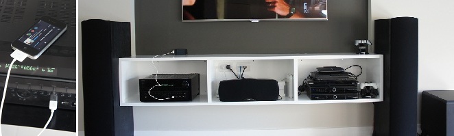 Pictured on left is the iPhone with the supplied iPhone cable connected to the front of an amplifier with a usb input on the front. We programmed the customer's existing universal remote control to switch to that usb input. We also, using tricks of the trade set it so that the customer had full control of the music: To be able to skip tracks, search for music and stop and rewind at will from the universal remote.